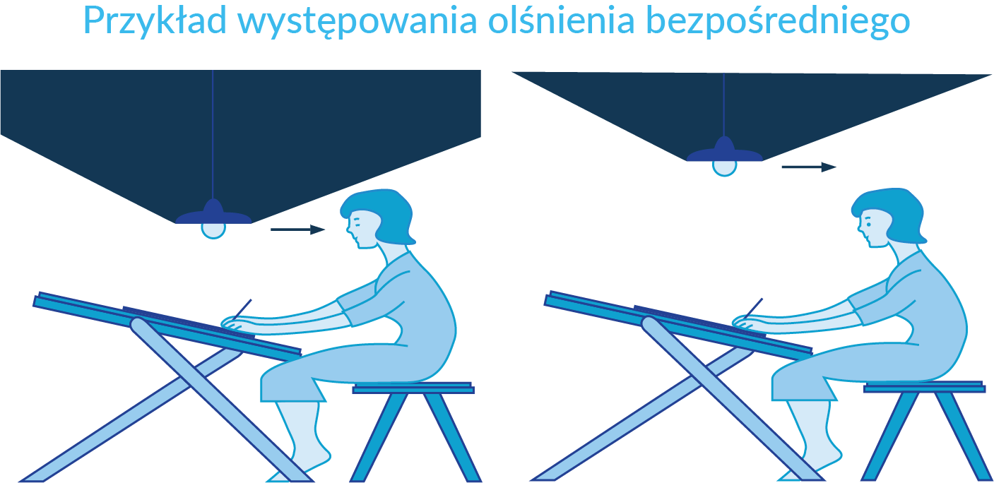 Efekt olśnienia, jego minimalizacja jest wskazana również na stanowiskach pracy związanych z produkcją oraz w przestrzeniach sprzedażowych.