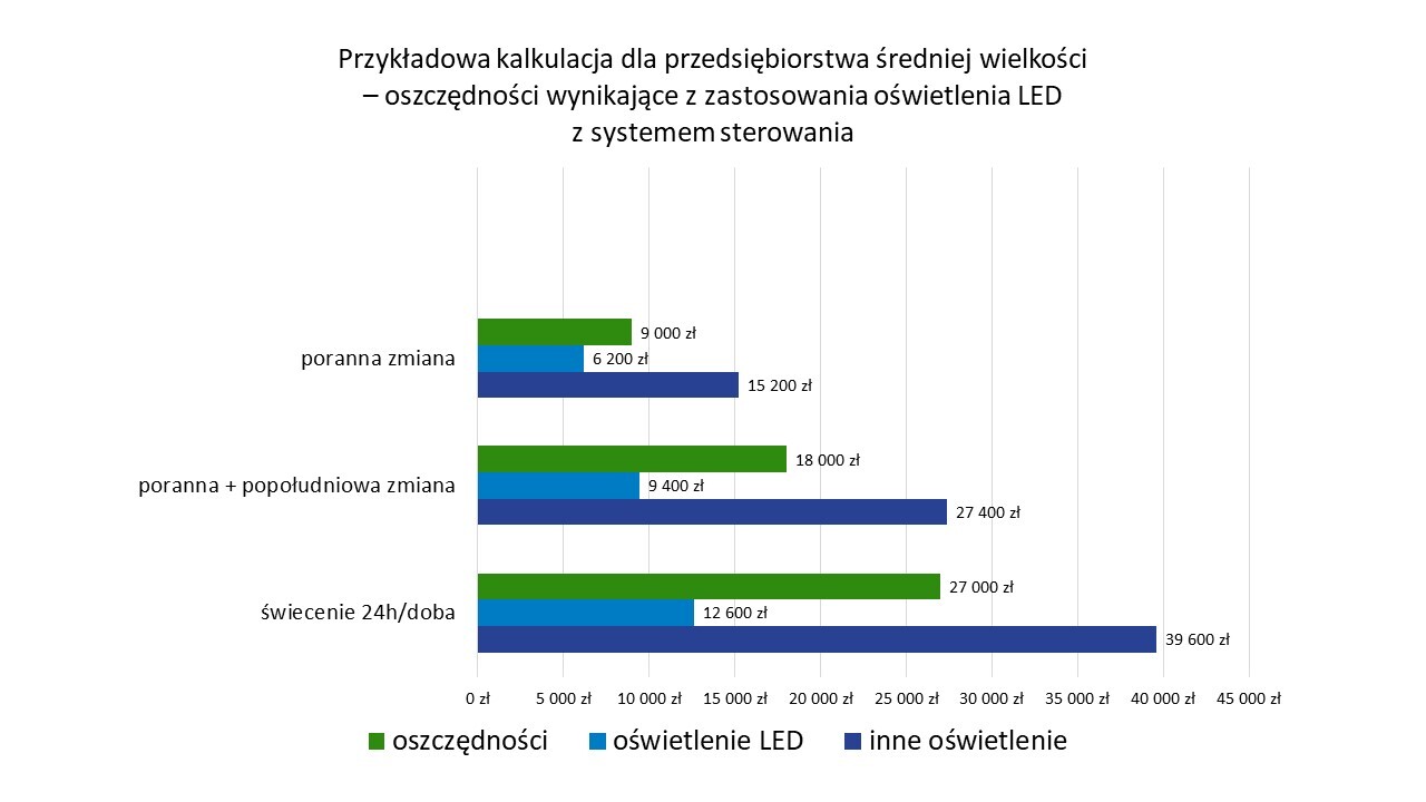 WSKAZÓWKA:Aby jeszcze bardziej pokazać Ci, jakie korzyści może przynieść wymiana przestarzałego oświetlenia na nowoczesne oprawy LED, zestawiliśmy koszty, jak i ich redukcję podczas 8-godzinnej pracy, na jedno i wielozmianowej zmianie, w przedsiębiorstwie o średniej wielkości.
